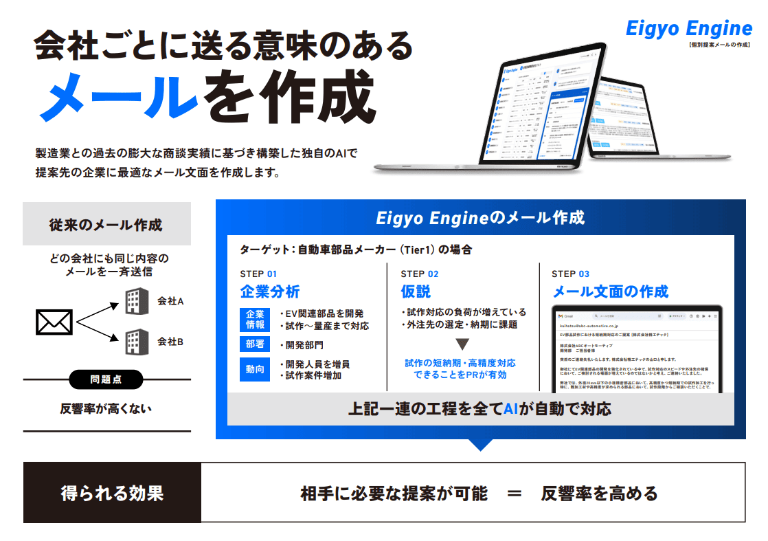営業製作所は、市場で最も付加価値の高いサービスを提供。営業、購買、DX推進などを支援する多様なITソリューション「ENGINEシリーズ」を展開しています。5年間で1800社以上の導入実績を誇り、お客様のビジネスを強力にサポートします。