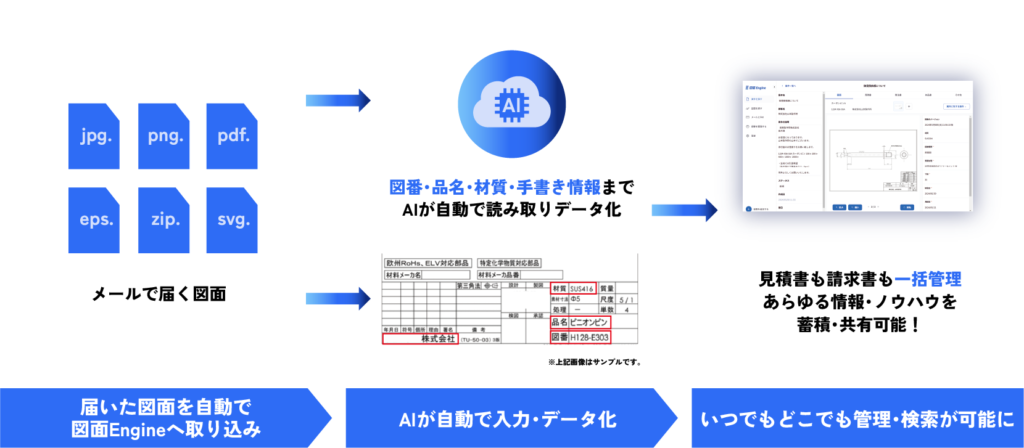 例えば、生産管理のひとつ「図面管理」を担うAI活用サービス”図面 Engine”では、手書き情報までAIが自動で読み取ることで、図面の取り込み・管理作業を90%削減可能です。