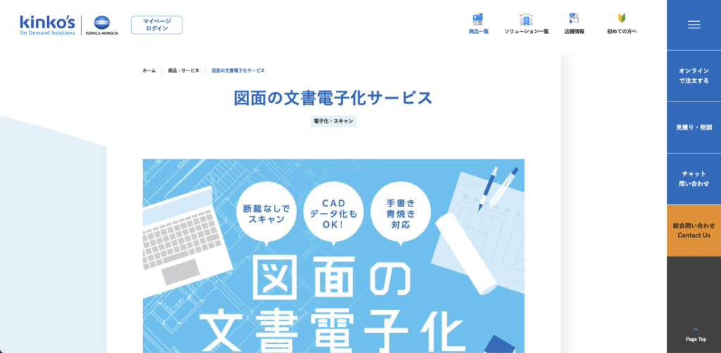 キンコーズ・ジャパン株式会社の図面の文書電子化サービスは、紙の図面をPDF化・CAD化して関係者共有ができるサービスです。手書きや青焼きの図面スキャンにも対応しており、図面以外の書面でも利用できます。データ共有クラウドサポートもあり、クラウド上でのデータのやり取りも可能です。