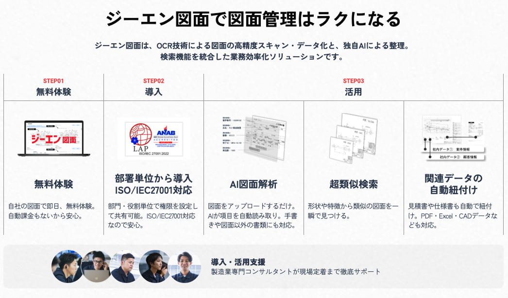 ジーエン図面は、OCR技術による書類・図面の高精度なスキャン・データ化と、独自AIによる整理・検索機能を統合した、業務効率化ソリューションです。製造業を中心に、大手自動車部品や大手工作機械メーカー、加工会社などで導入が進んでいます。