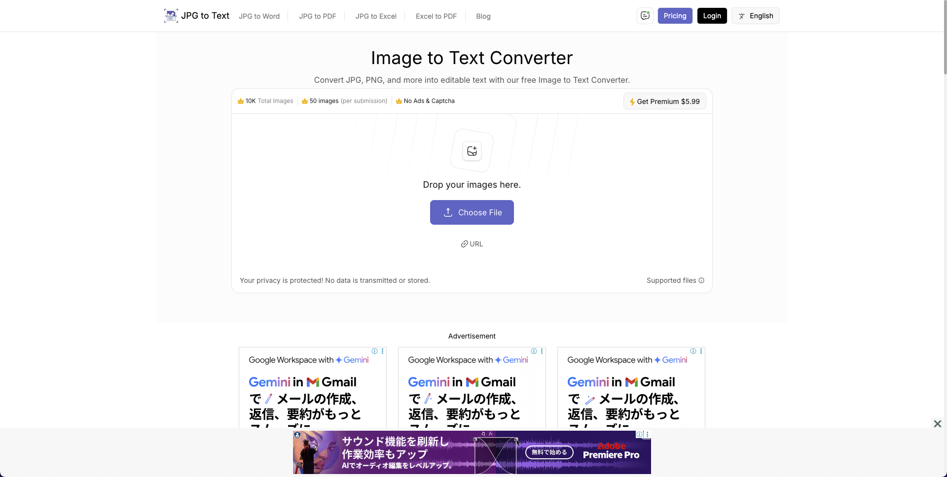 JPGtoText.comは、ブラウザ上でJPGなどの画像のテキスト化が可能なオンラインOCRです。AIを用いた精度の高い文字認識が可能で、複数のファイルの一括処理にも対応しています。無料で利用できるため、機密情報を含まない個人用の書類の処理に便利です。