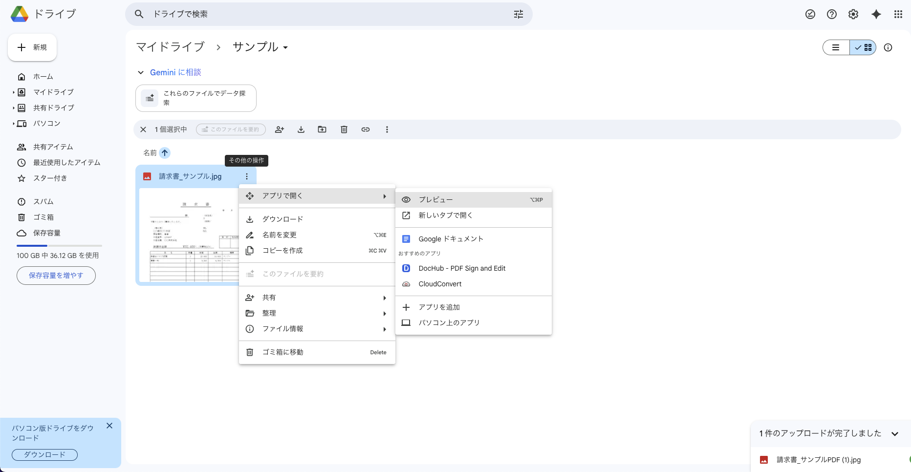 JPG画像をアップロードできたら、「その他の操作」から「アプリで開く」「Googleドキュメント」の順で選択しましょう。
