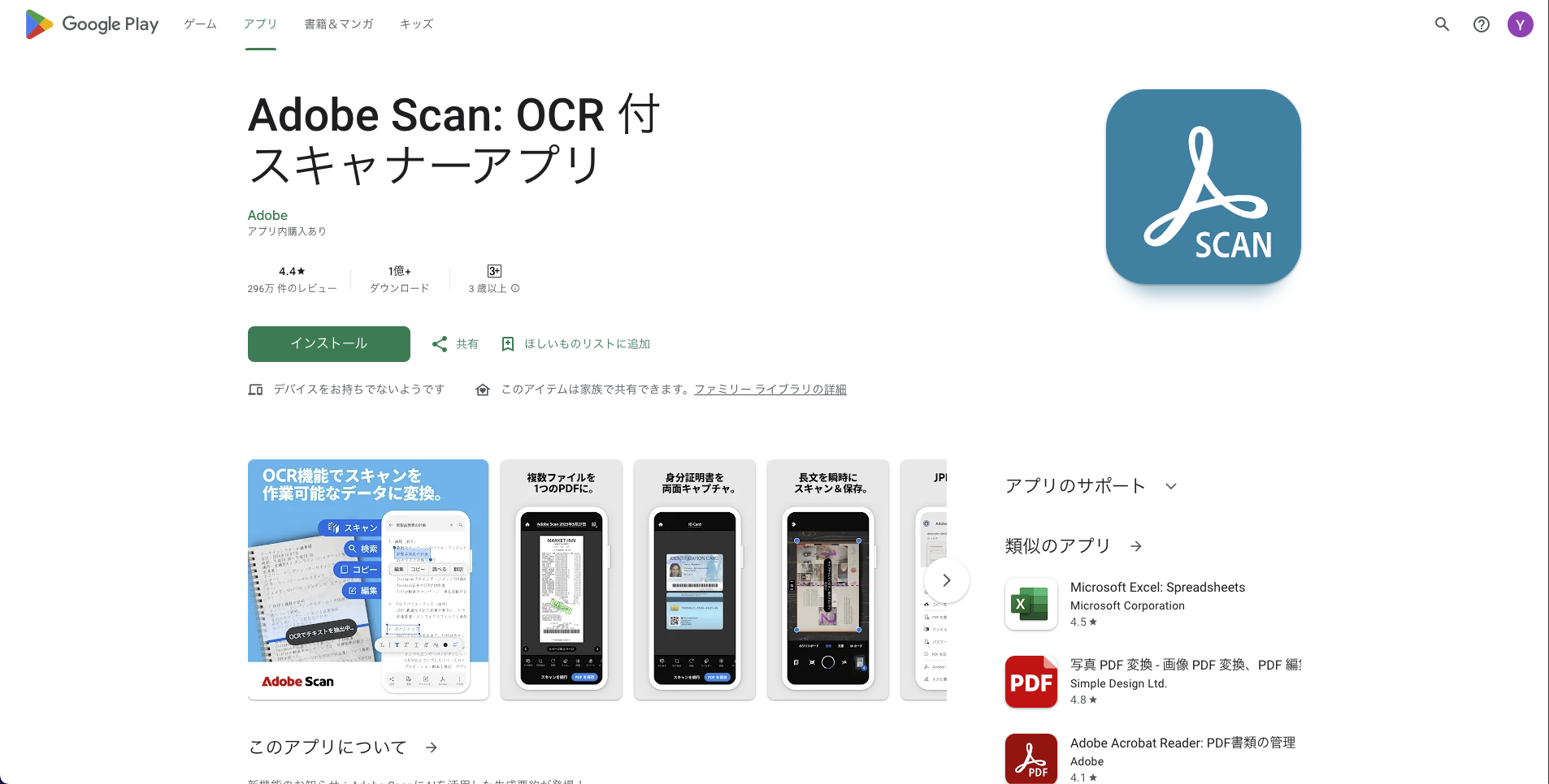 Adobe Scanは、写真などに含まれる文字を認識し、テキストやPDFに変換できるアプリです。Android・iOSの両方のデバイスで利用できます。変換後のデータの保存・共有も可能で、ほかのAdobe製ソフトとの連携ができる点も魅力です。