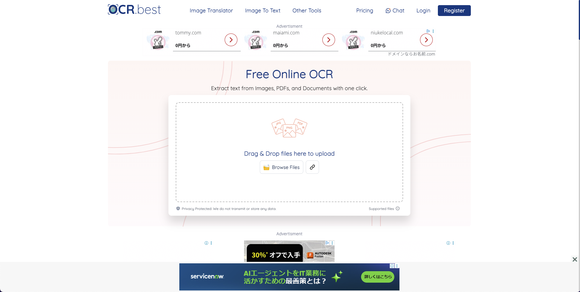 OCR.bestは、完全無料で利用できるオンラインOCRサービスです。JPGなどの画像やPDFをアップロードするだけでテキストを抽出でき、シンプルかつスピーディに利用できます。アカウント登録不要で利用できるため、試験的にOCRを導入したい個人や小規模利用に適しています。