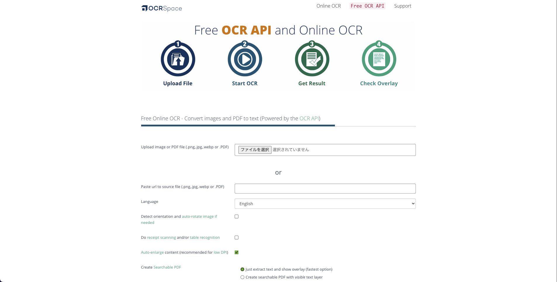 OCR.spaceは、Web上で気軽に使える無料OCRです。JPGなどの画像をアップロードすれば、文字を認識してテキストに変換できます。日本語にも対応しており、個人向けのオンラインOCRとしては候補となるサービスです。