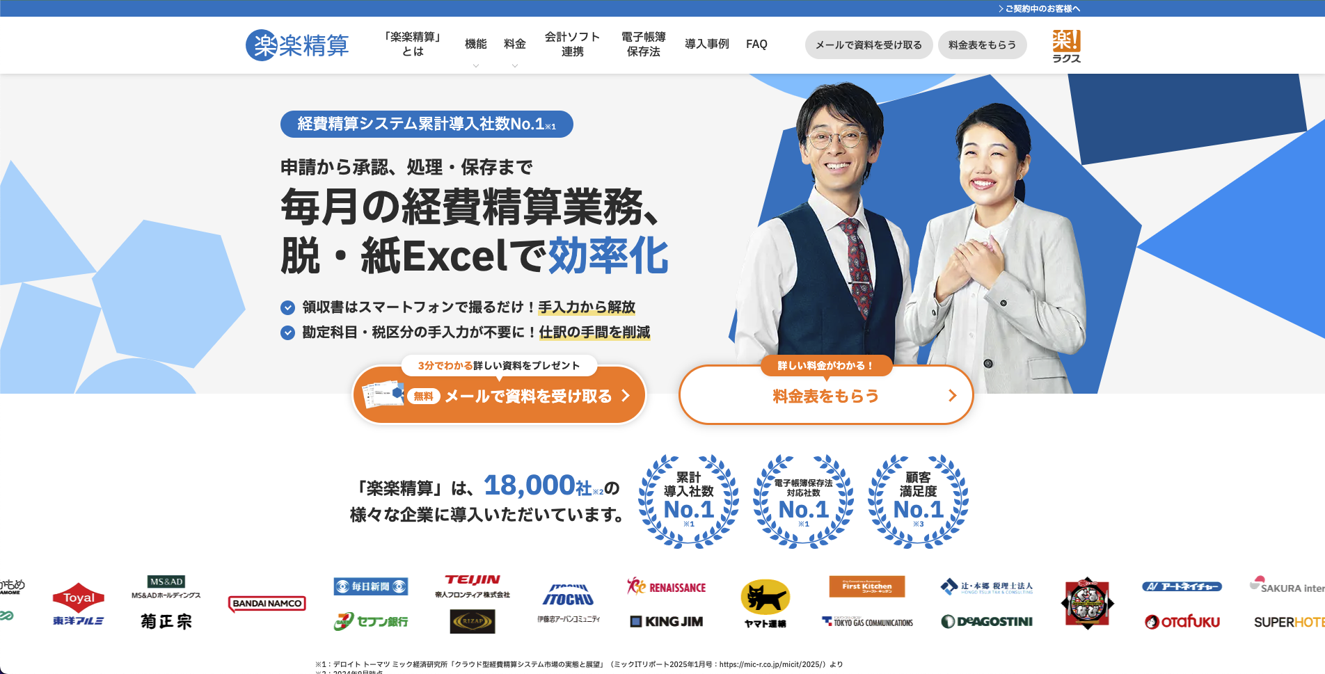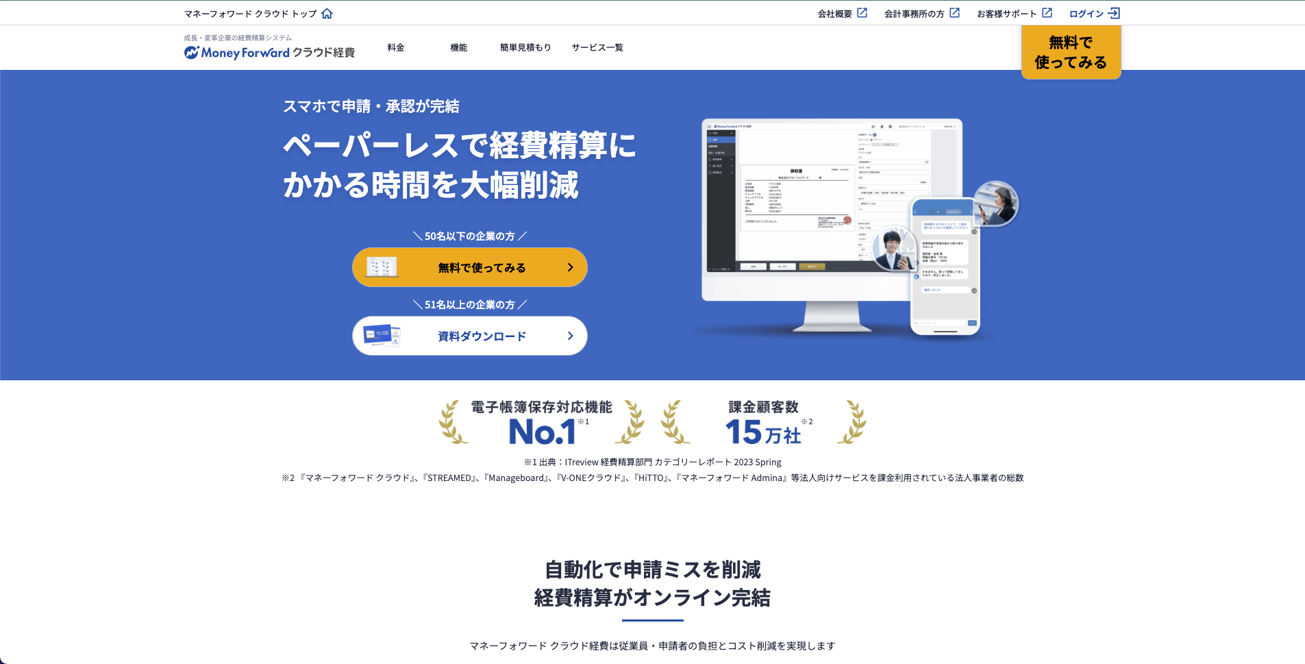 マネーフォワード クラウド経費では、レシート撮影で自動読み取りし、申請・承認・仕訳までをクラウドで一元管理できます。電帳法対応・スマホ/Web両対応・2,500以上の金融機関連携など規模・用途を問わず幅広く使えるのが利点です。一部、従量課金制なので小規模でも導入しやすいでしょう。