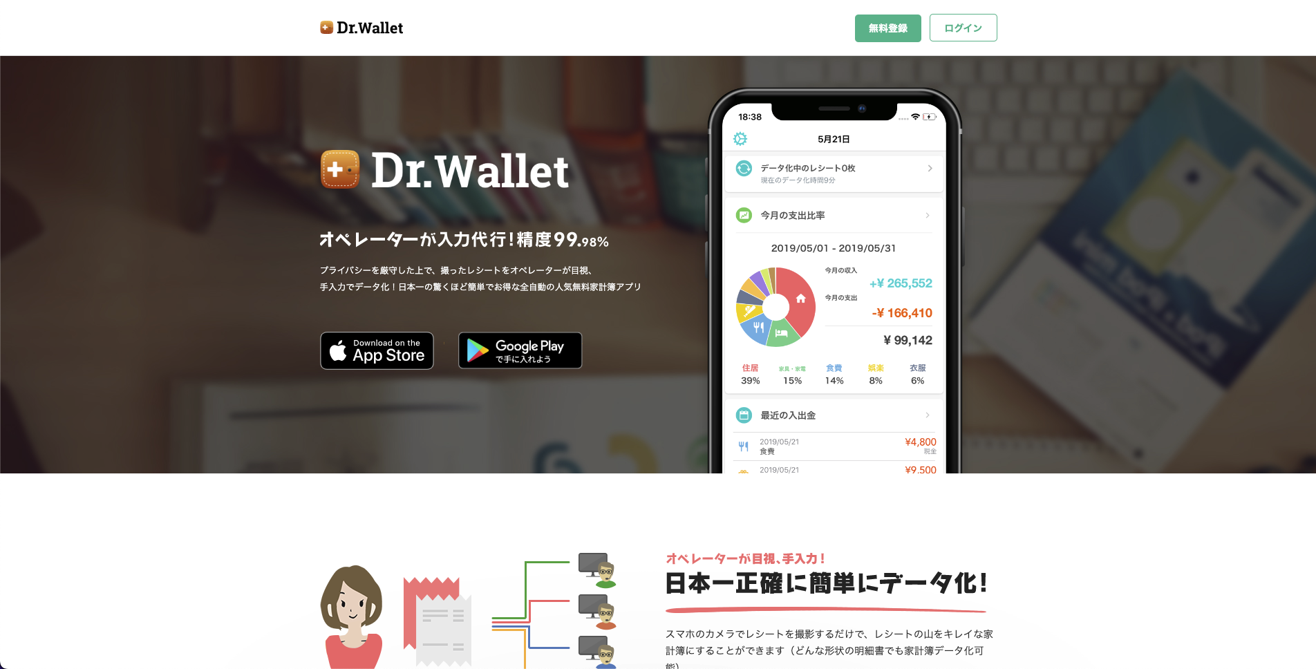 Dr.Walletは、どんな明細でもデータに反映できる家計簿アプリです。レシート読み取りはオペレーターが代行入力する仕組みを採用しているため、わかりにくい明細・レシートでも家計簿に追加できます。クレジットカードなどとの連携も可能です。