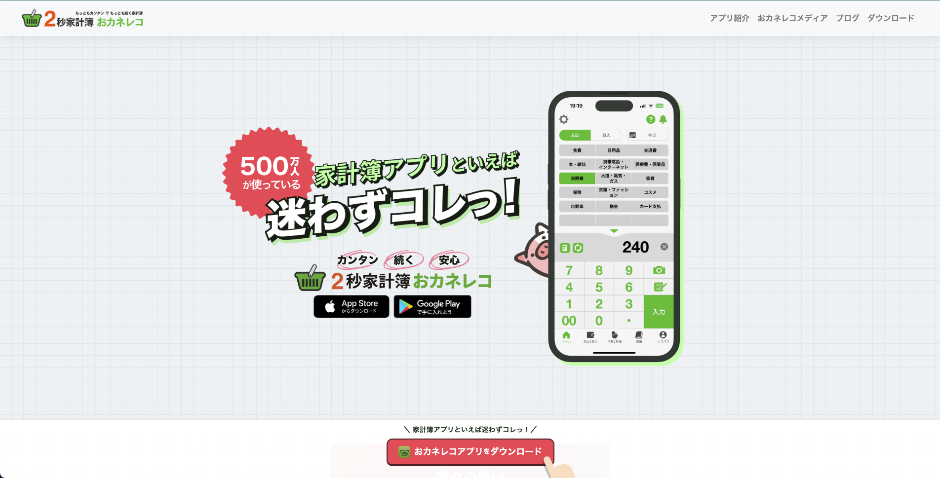 2秒家計簿「おカネレコ」は、ファイナンシャルプランナーが作った便利な家計簿アプリです。AIが入力サポートや家計へのアドバイスをしてくれるのが大きな特徴で、簡単かつ続けやすいことを魅力としてアピールしています。無料プランもありますが、レシート読み取りができるのは有料プランです。
