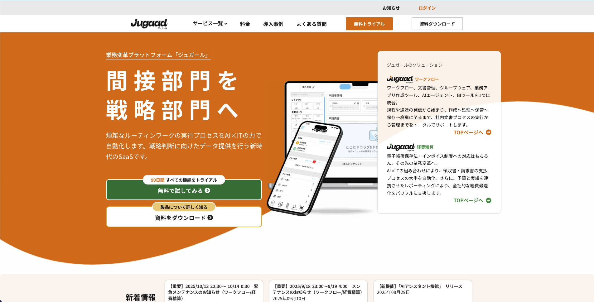 Jugaad(ジュガール)は、ワークフローや経費精算などの業務を効率化できる業務変革プラットフォームです。スマホアプリを使ってレシートを撮影するだけで、簡単に経費精算ができます。LINE WORKSやTeamsなど外部システムとの連携ができるのもポイントです。