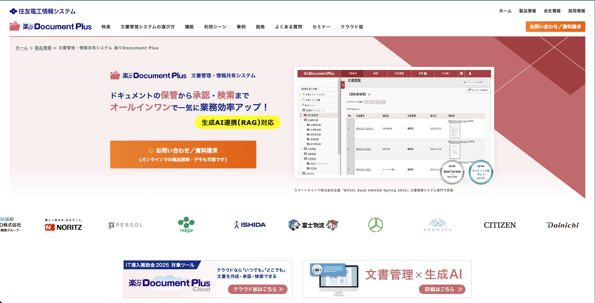 楽々Document Plusは、住友電工情報システムが提供している文書管理・情報共有システムです。図面だけでなくさまざまな書類の管理に対応しているのが特徴で、生成AIとも連携しているため情報活用を効率化できます。導入形態はクラウド型・オンプレミス型のどちらも選択可能です。