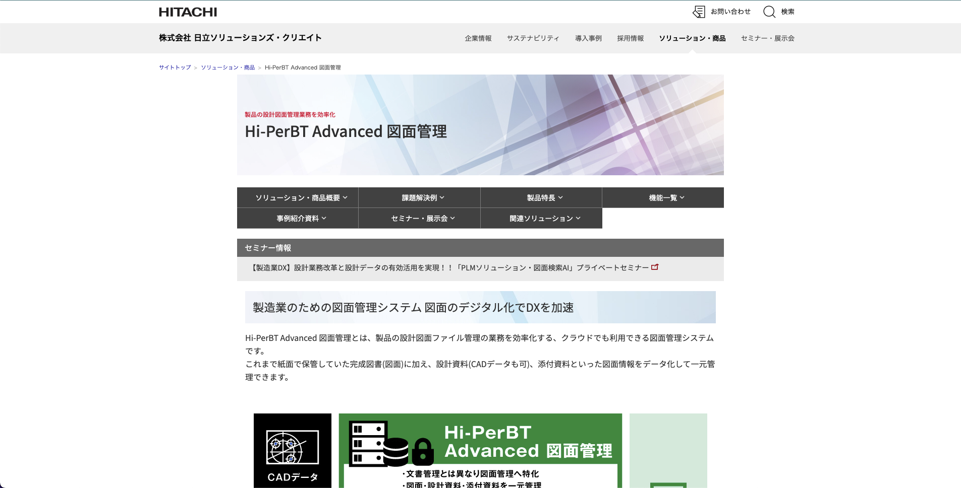 Hi-PerBT Advanced 図面管理は、日立グループの株式会社日立ソリューションズ・クリエイトが提供する図面管理システムです。製造業向けのシステムで、完成図面・設計資料・添付資料などの関連情報を一元管理できます。利用者数に制限がないため、大きな部署・チームでも活用可能です。
