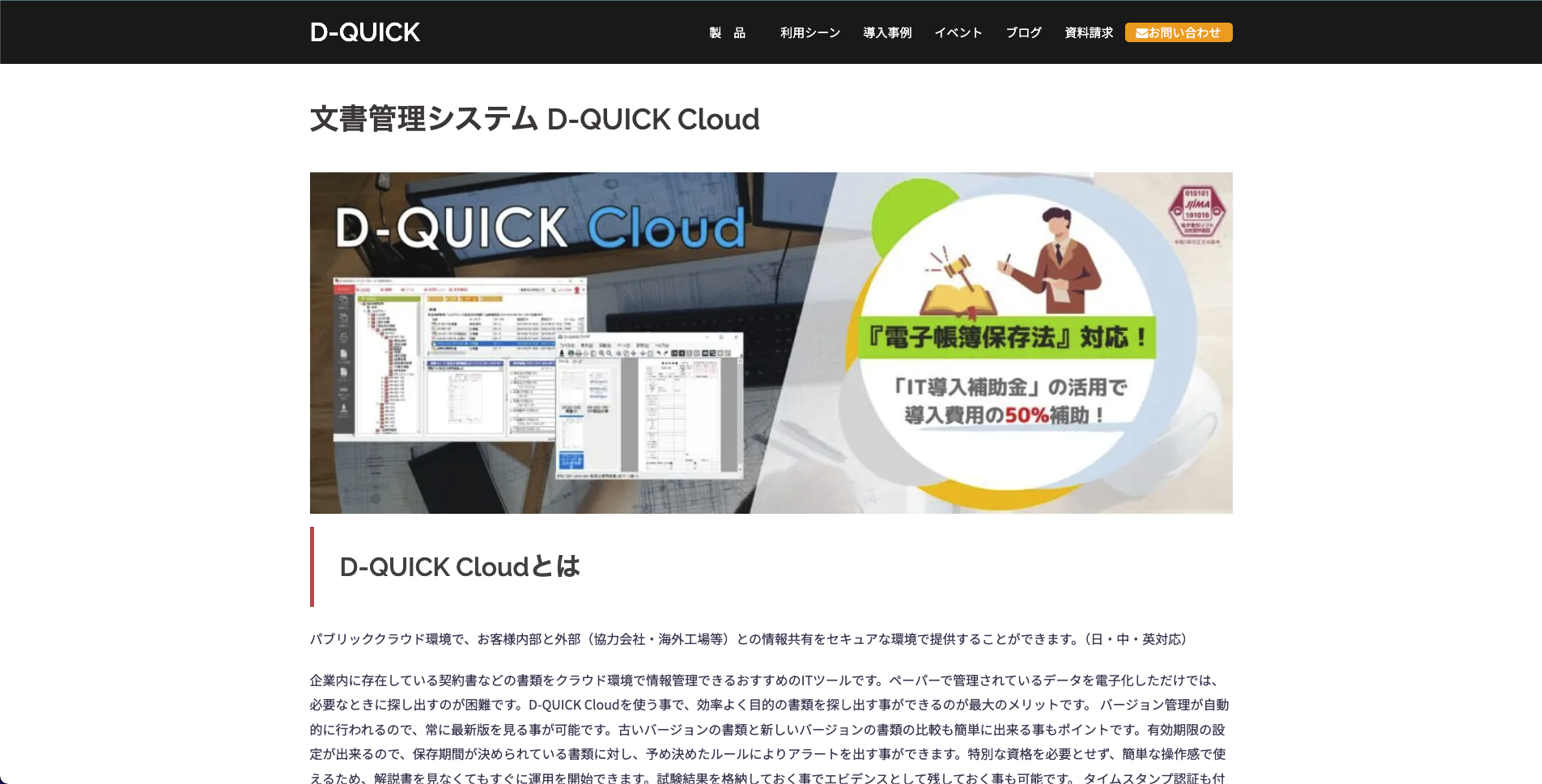 D-QUICK Cloudは、図面や契約書などの書類をクラウド環境で管理できるシステムです。書類の検索機能やバージョン管理機能など基本的な機能を備えています。ワークフローも標準搭載しており、脱ハンコを目指す企業にも使いやすいでしょう。