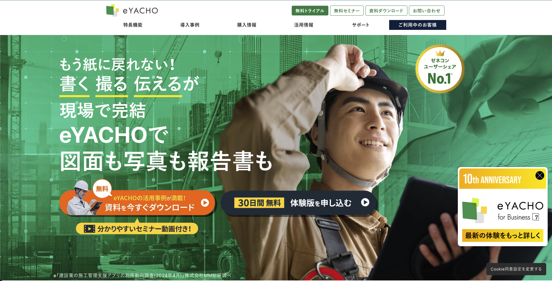 eYACHOは、図面・写真・報告書などを管理できるシステムです。現場業務の効率化に特化したシステムで、PCだけでなくタブレットでも利用できます。データ化した図面などに手書きでメモを書き込めたり、同時共有やビデオ通話もできたりするなど、現場での図面活用を効率化可能です。