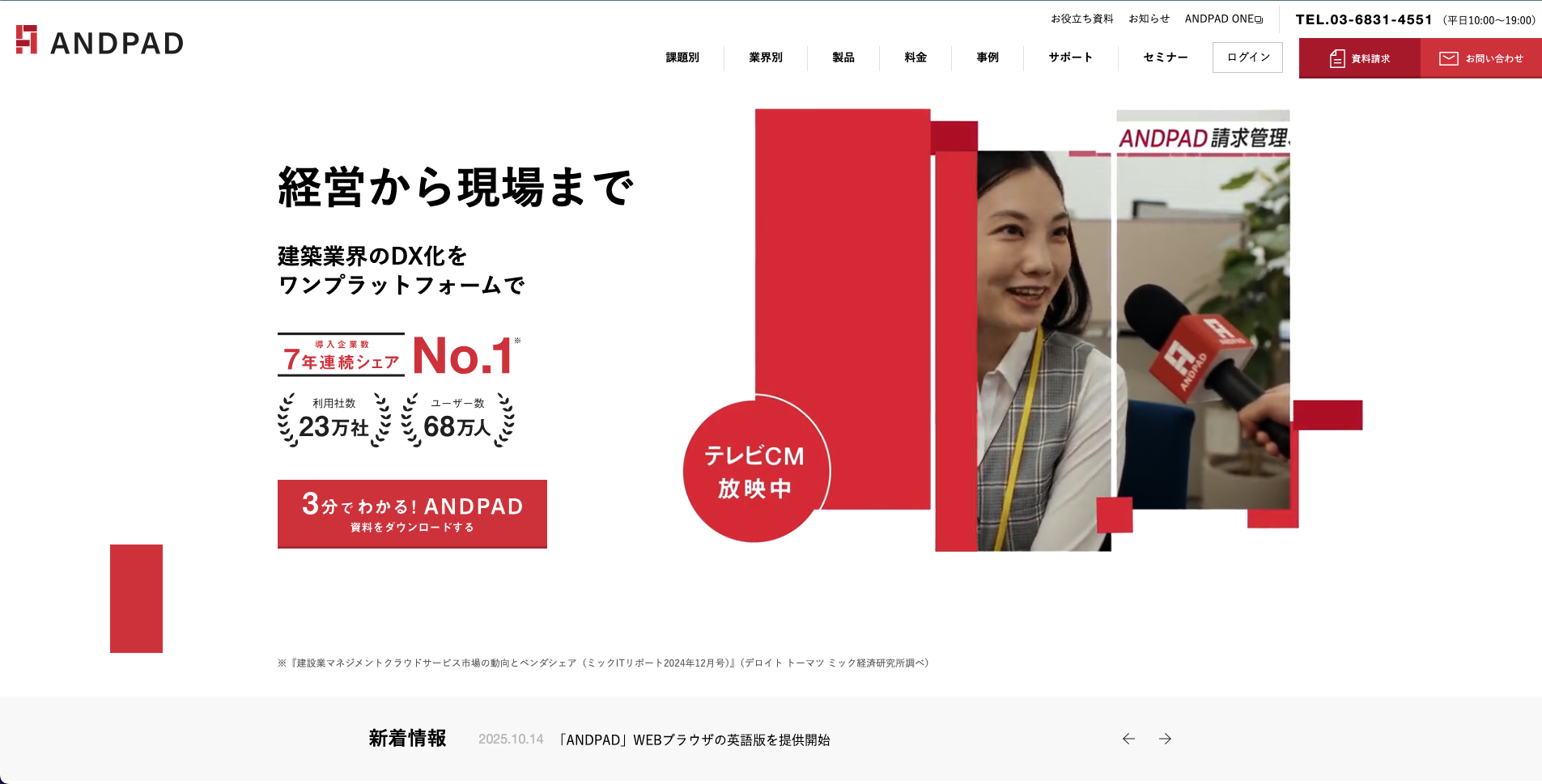 ANDPADは、建築業界向けのクラウド型プロジェクト管理サービスです。施工管理や図面管理だけでなく、現場カレンダーやチャットなどの機能も搭載しており、現場関係者間で便利に活用できます。23万社以上の利用実績があるため、大手システムを利用したい企業にもおすすめです。