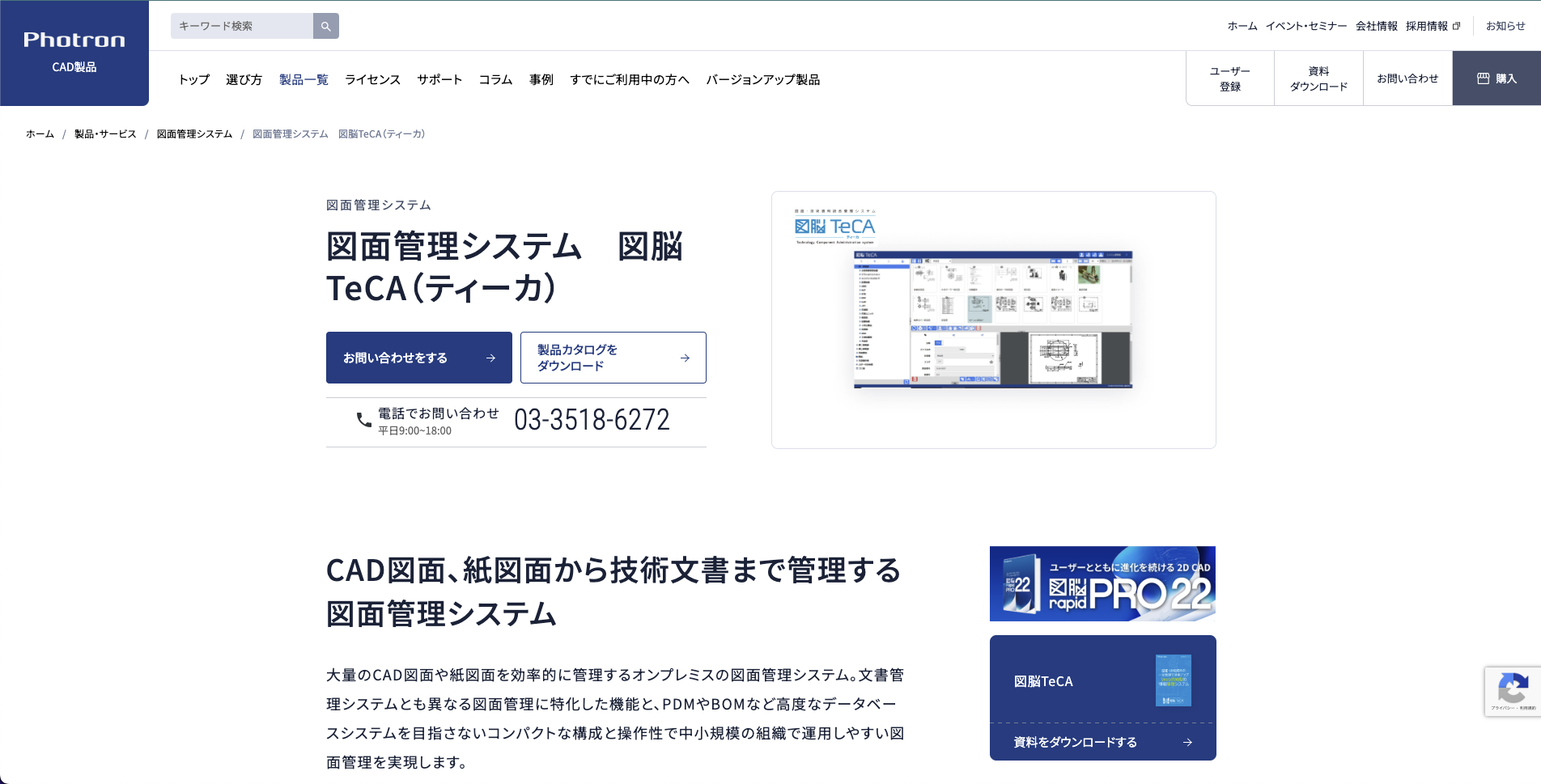 図面TeCAは、CAD図面・紙図面を含む技術文書を管理できる図面管理システムです。製造現場部門での運用を想定しており、必要最低限の機能に絞ったシンプルで扱いやすい仕様が魅力だといえます。主に中小規模の組織での運用に適している点も特徴です。