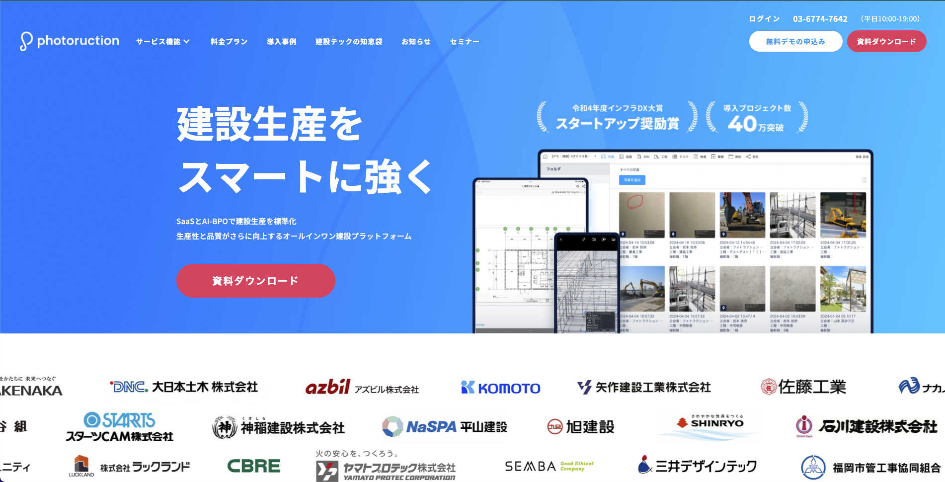 Photoructionは、建設生産の業務効率化を実現可能なソフトウェアです。図面・書類・写真・工程などの一元管理・共有機能を備えているほか、自社向けのカスタマイズができるのも魅力だといえます。自社独自のルールがある場合にも比較的導入しやすいでしょう。