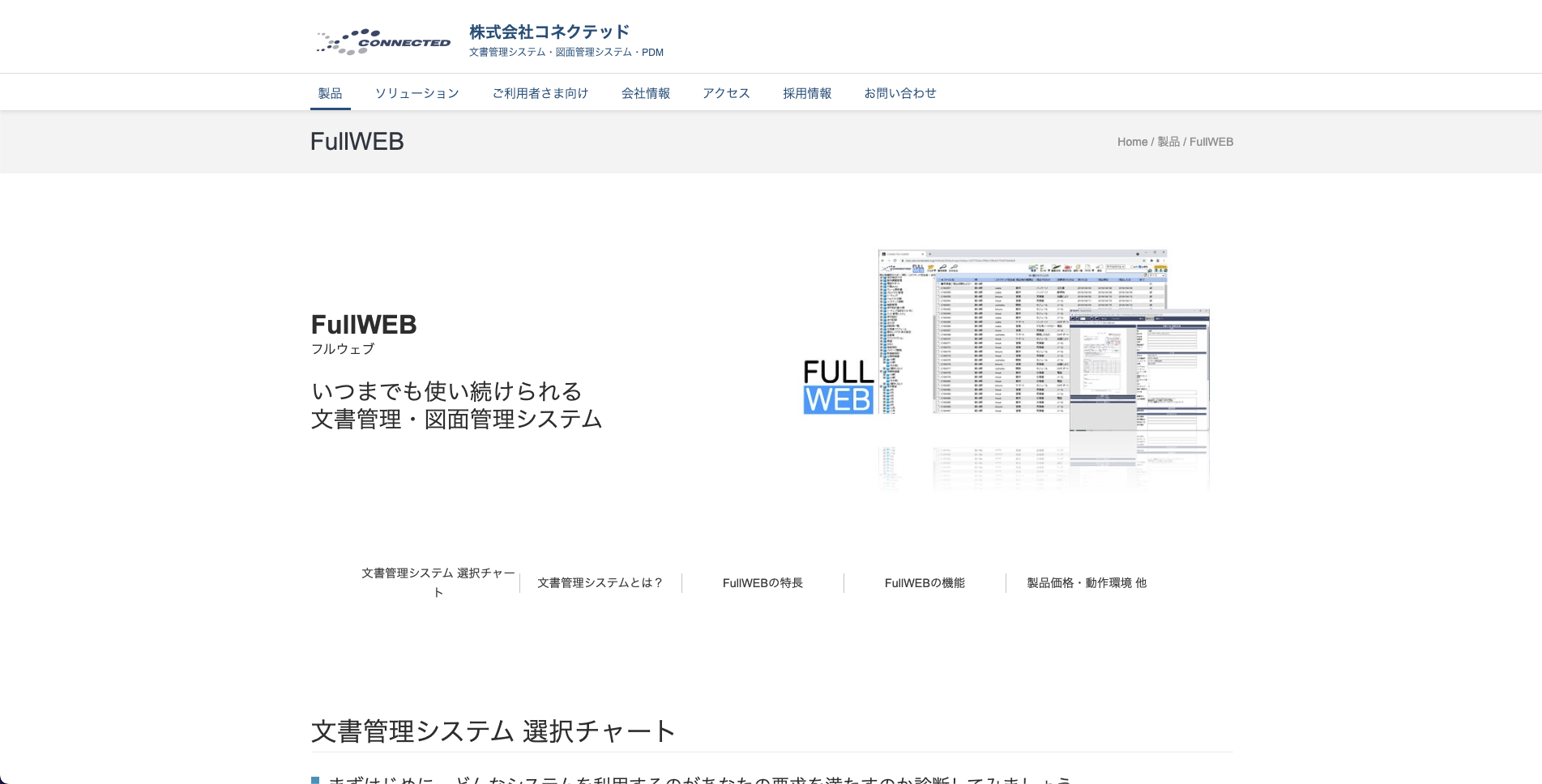 FullWEBは、1,000社を超える導入実績のある文書管理・図面管理システムです。属性項目は運用開始後にも設定でき、文書への属性設定は自動化が可能です。比較的早期に運用を開始できる点を魅力としてアピールしています。
