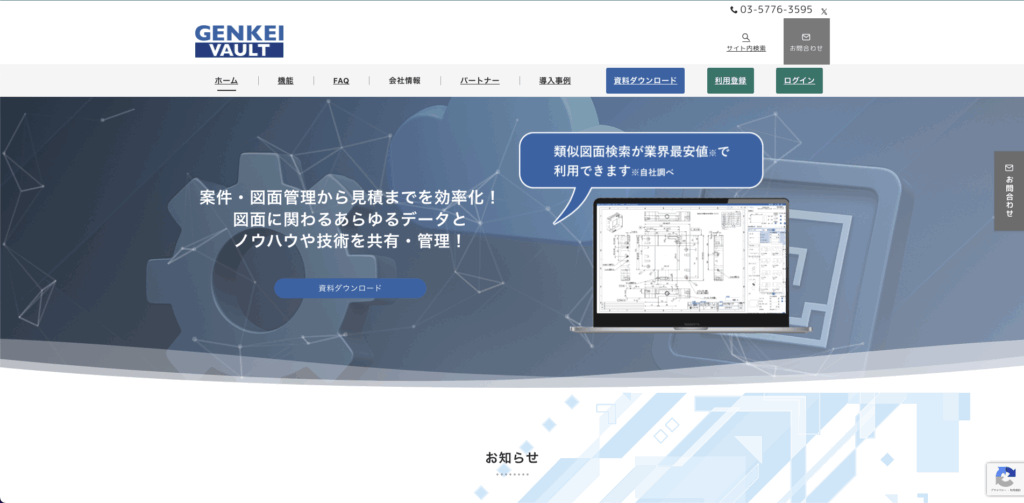 GENKEI VAULTは、図面・見積・原価といった製造業の重要データを一元管理するためのクラウドサービスです。案件ごとに情報を蓄積し、過去の見積条件や原価情報を参照しながら新規見積に活用できます。設計・営業・製造の情報連携を強化できる点も特徴です。