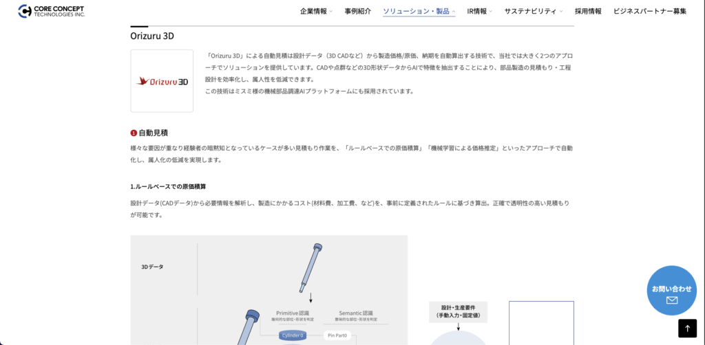 Orizuru 3Dは、3D CADデータを解析し、製造可否判定や概算見積支援を行うAIサービスです。形状の複雑さや加工難易度をもとに、製造上の課題を可視化できるため、見積前段階での判断精度が向上します。3Dデータを活用した見積業務を進めたい企業に有効です。