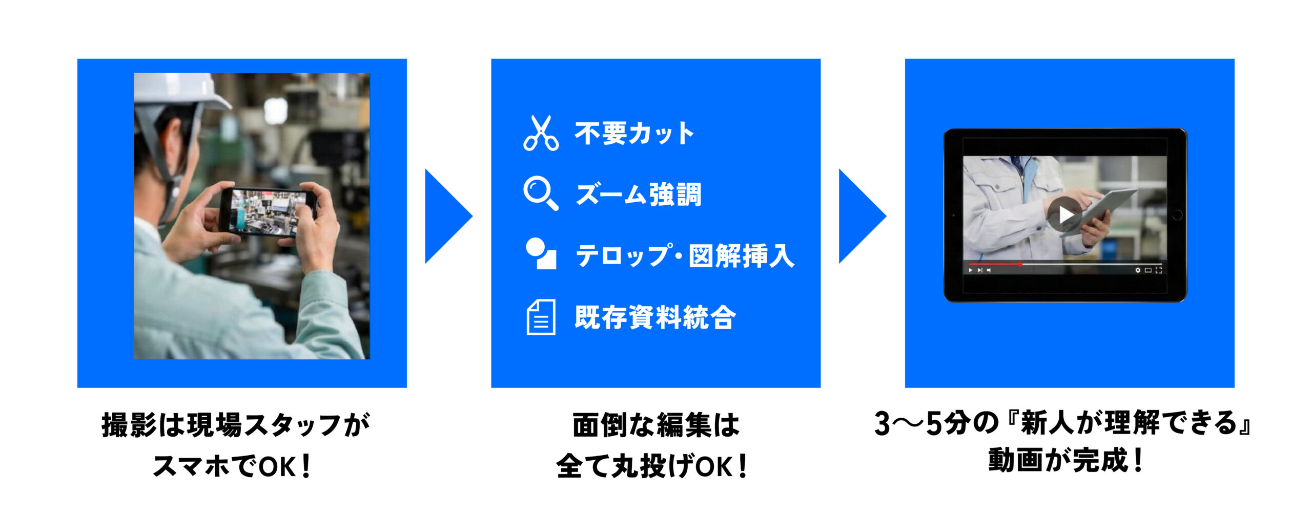現場で行っていただく作業は、スマートフォンで作業の手元を「撮影して送るだけ」です。面倒な台本作成や、不要カットの削除、ズーム強調、テロップ入れ、図解の挿入などは、製造業の現場を知り尽くしたプロの編集チームがすべて代行します 。