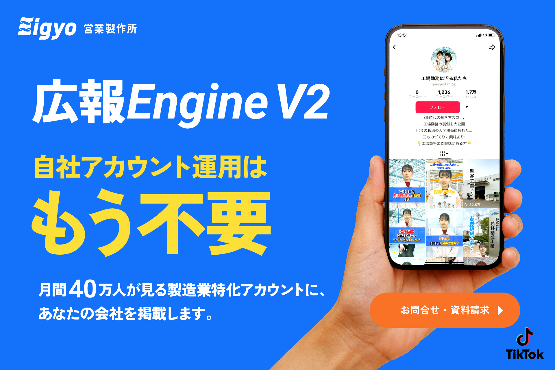 月間40万人が視聴する国内最大級の製造業特化TikTokアカウント『工場勤務に沼る私たち』に、貴社の紹介動画を掲載しませんか?自社アカウントを育てる手間は一切不要。圧倒的なリーチ力で貴社の「現場の魅力」を届け、職場体験から長期採用へと繋げる新しい採用導線を構築します 。