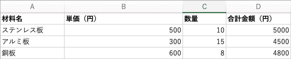 ここで、各材料の合計金額を =B2*C2
