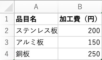 まず、Excelに以下のような材料費リストを用意します。