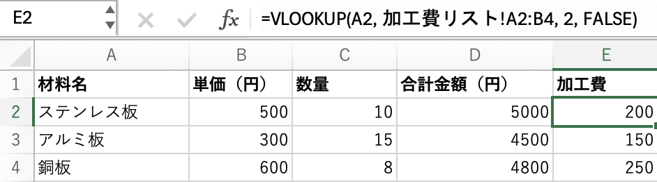 例えば、材料費リストのE2セルでステンレス板の加工費を参照するには、次のようにVLOOKUP関数を使います。