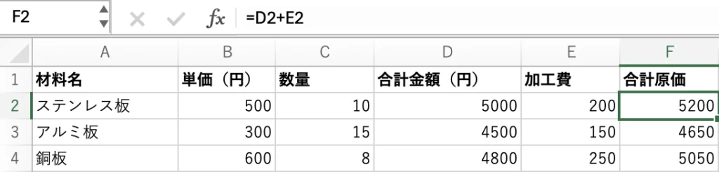 この式で、材料費の合計を簡単に算出できます。