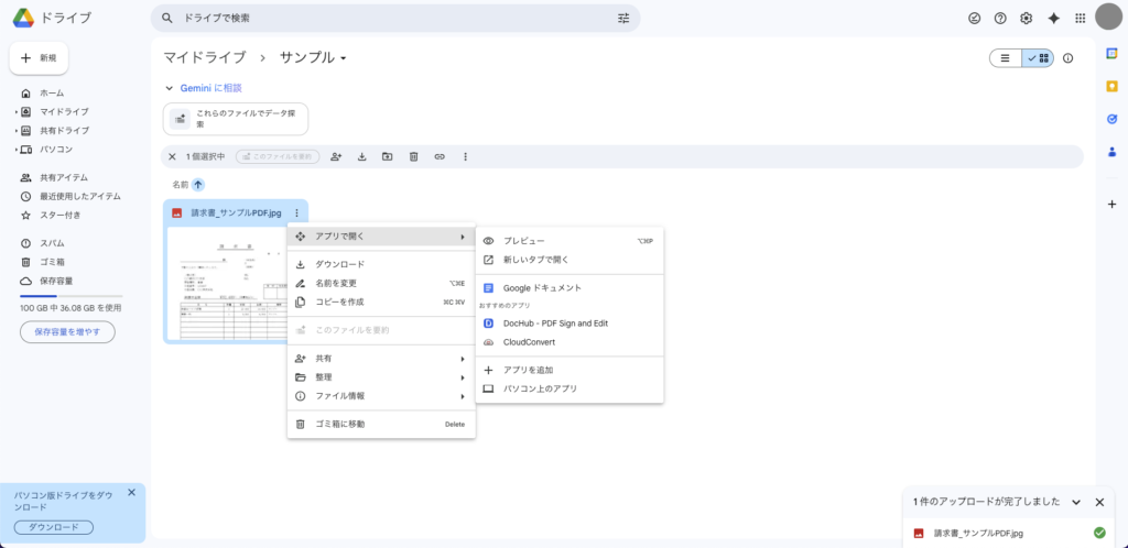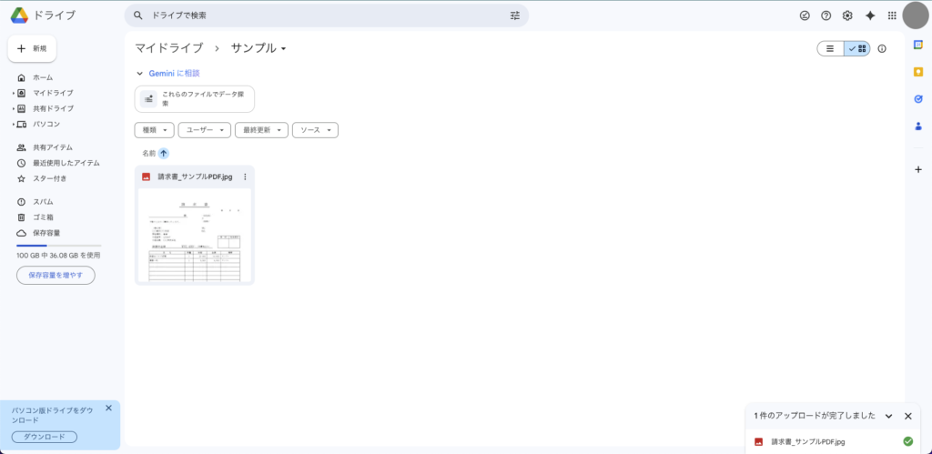 Googleドライブを開いたら、OCR機能を使いたいファイルをアップロードしましょう。今回はPDF化した請求書のサンプルを利用します。