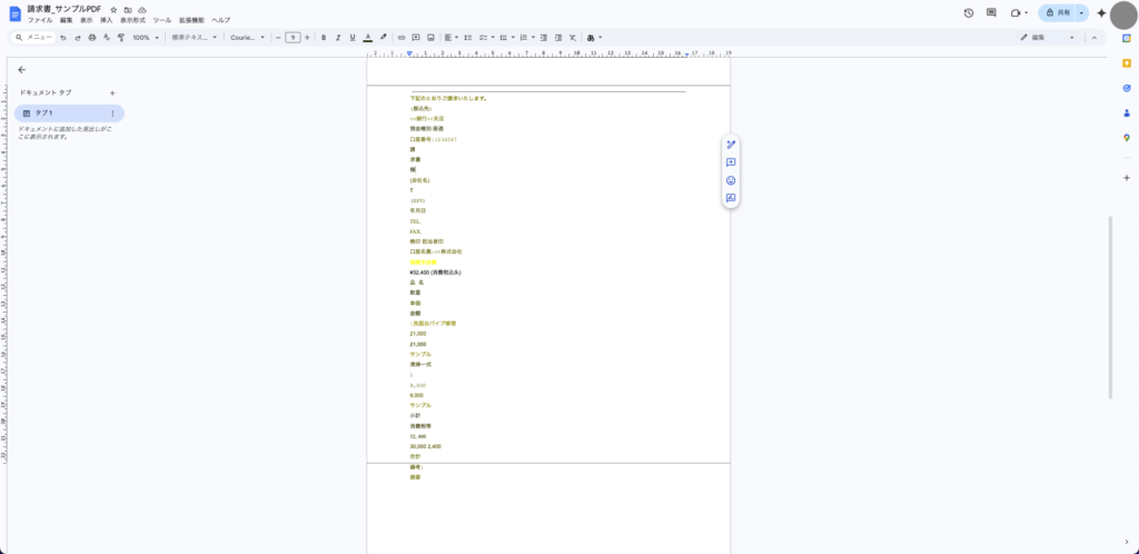 Googleドキュメント上に、PDF記載の文字がテキスト化された状態で出力されます。これで、Googleドライブを使ったPDFのテキスト化は完了です。表などの体裁は崩れますが、請求書に記載されていた文字は正しくテキスト化できました。