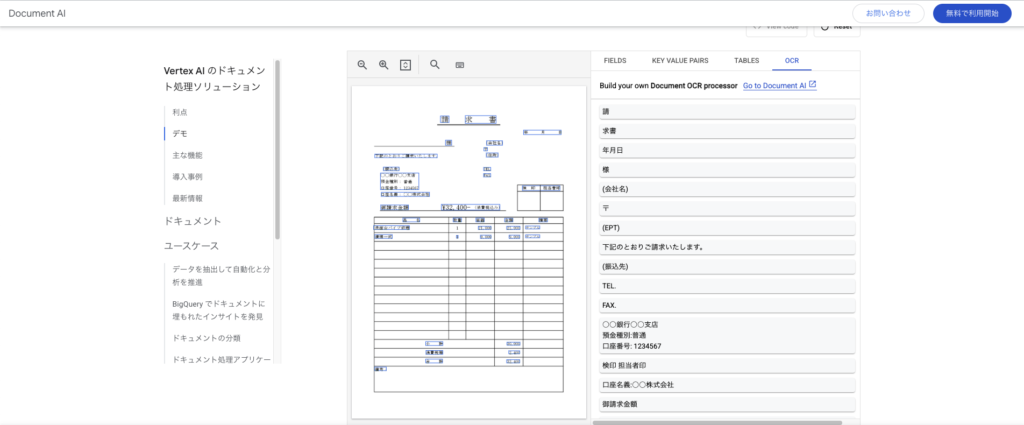 右上の「OCR」を選択すると、PDFの内容がテキスト化されて表示されます。これでGoogle Cloud Document AIによるPDFのテキスト化は完了です。PDFに記載された文字を漏れなくテキスト化できましたが、「請」「求書」が分かれて抽出されるなど、やや調整が必要でした。