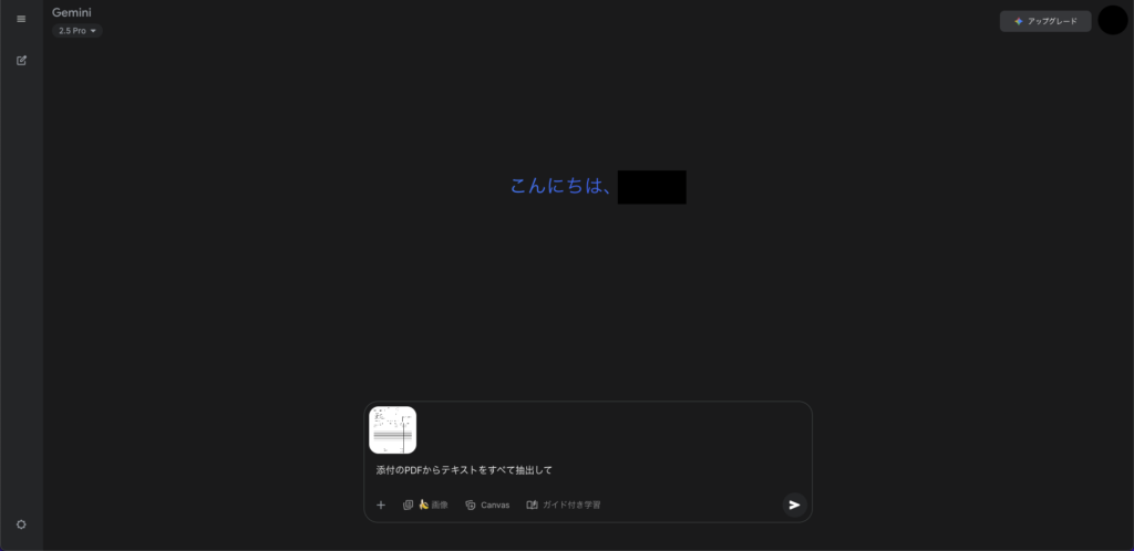 ここで左上のGeminiのモデルが「2.5 Flash」になっている場合は、モデルを「2.5 Pro」に変更してください。続いて、Geminiでテキスト化したいファイルをアップロードします。ドラッグ&ドロップでOKです。