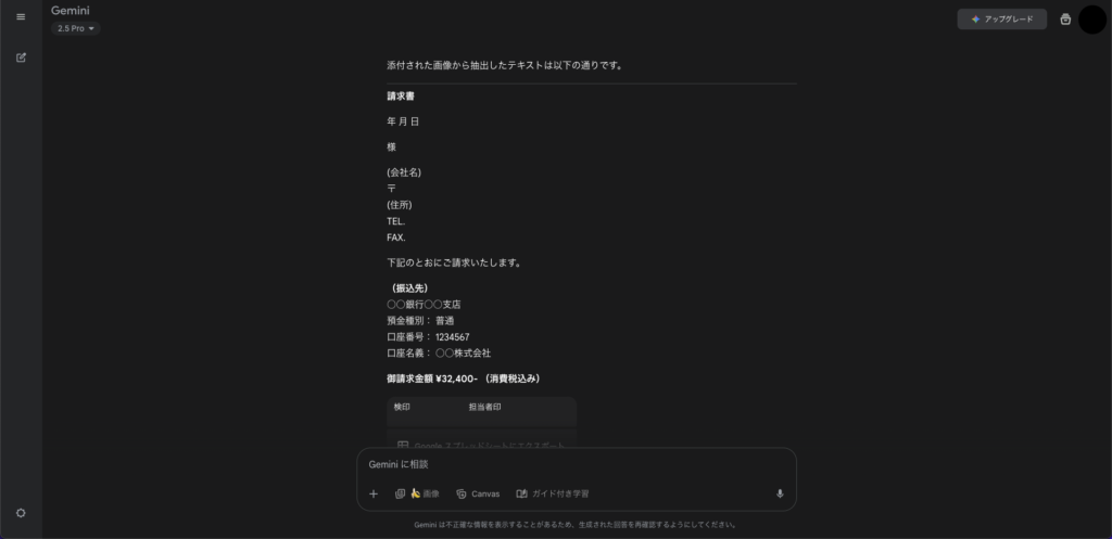 これでGeminiのOCR機能によるテキスト化は完了です。「下記のとおにご請求いたします。」などやや抜けはあるものの、すべての文字をテキスト化できました。