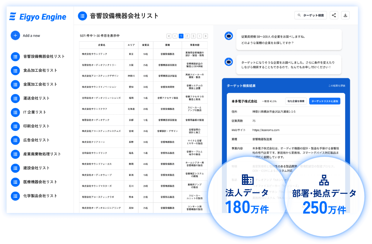 180万社のデータベースから絞り込み -