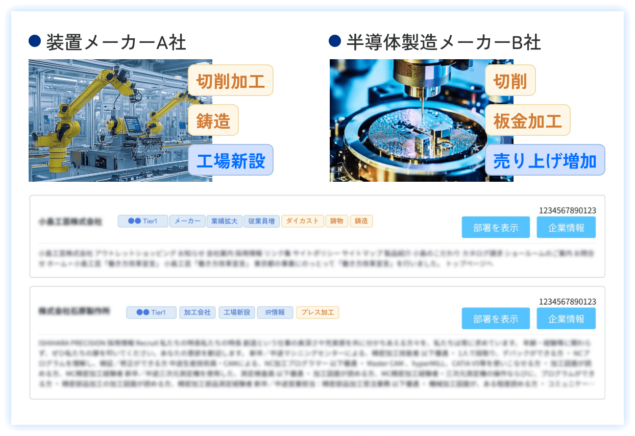 また当社独自のネットワークを活用し、商流やグループ関係、工場の新設、設備投資などの情報も追加することに成功しているので、高精度なマッチングが可能です。 -