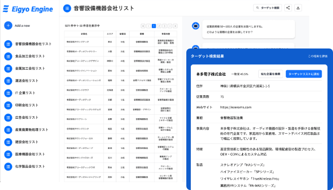 Eigyo Engineとは、製造業に特化した180万社のデータベースと、加工方法や材質などの技術を必要としている企業の絞り込みを駆使して、